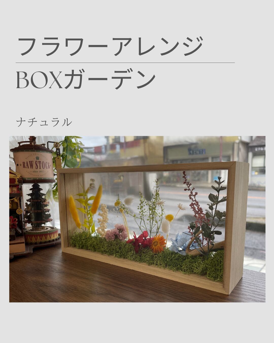 「フラワーアレンジ BOXガーデン」は、プリザーブドフラワーやドライフラワーを贅沢に使用し、木製フレームのBOXの中に、四季の彩りを感じるガーデン風景を再現した置物です。