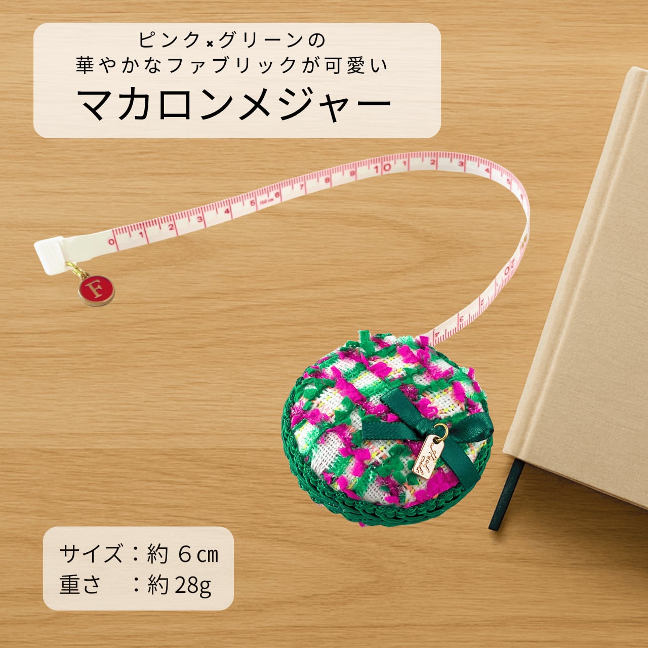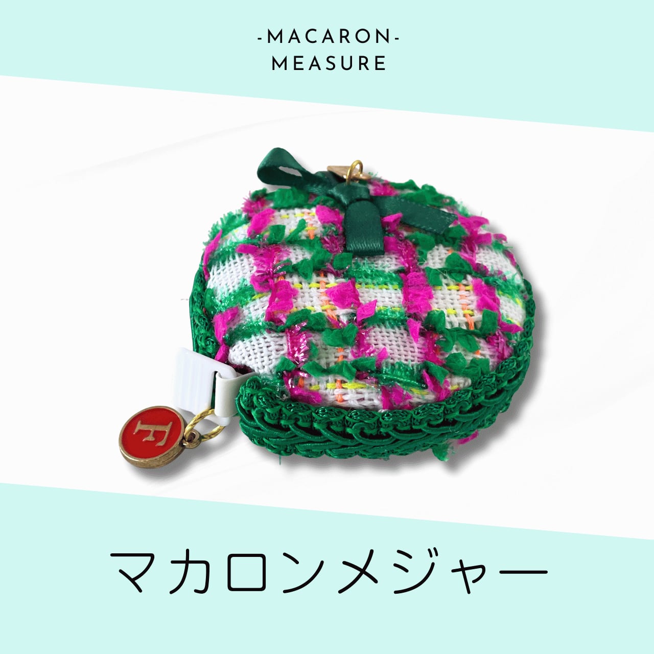 ころんと可愛いマカロン型のメジャーが登場しました。 ピンク×グリーンの華やかなファブリックに、リボンとチャームがきらりと輝きます。