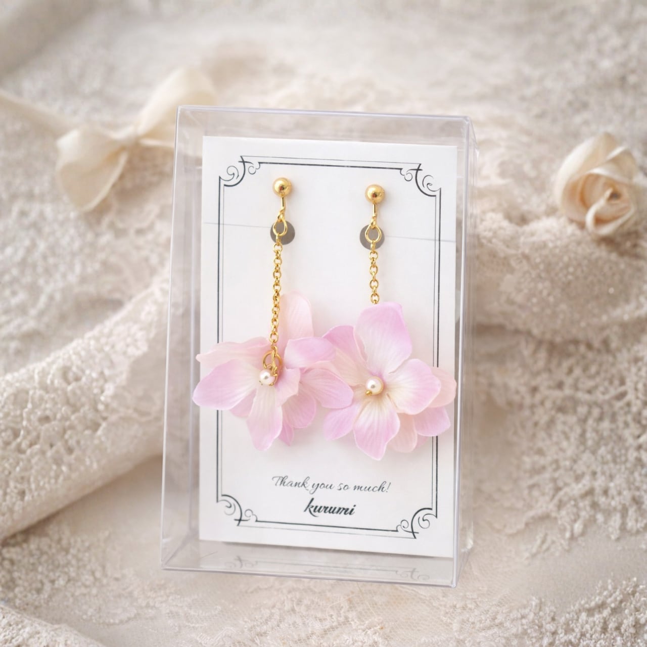 やさしいピンクカラーと繊細な布花の組み合わせが、身に着けるだけで気分までふんわりと華やぐようなイヤリングに仕上がっています。